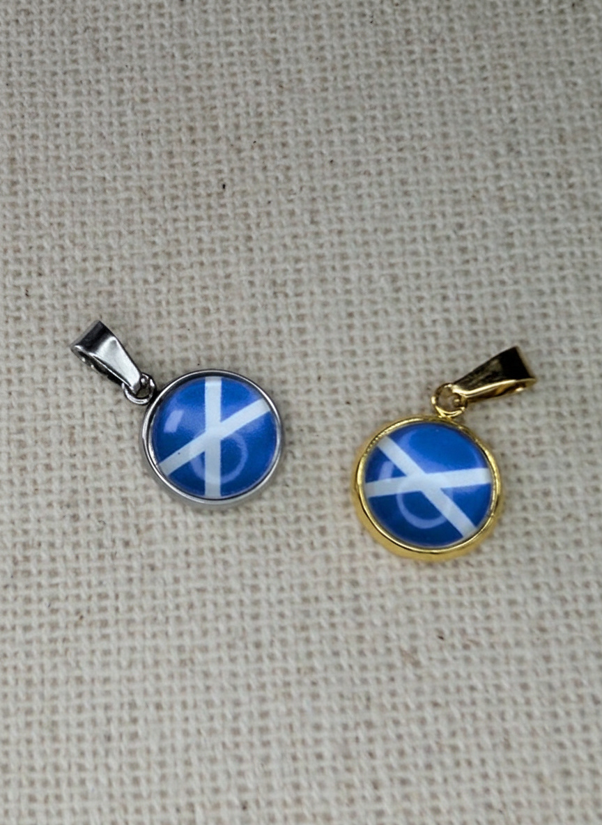 The Scotland Flag Pendant – Small Glass Finished Charm proudly displays the iconic white saltire on a bold blue background, symbolising Scotland’s rich history and heritage. The flag design is carefully sealed beneath a smooth glass finish, giving the charm a glossy, polished surface that enhances the vibrant colours and protects the intricate details. Its eye-catching yet compact size makes it a subtle and meaningful way to celebrate Scottish pride.